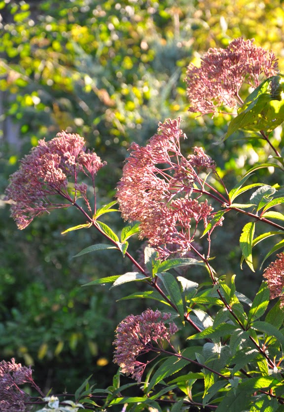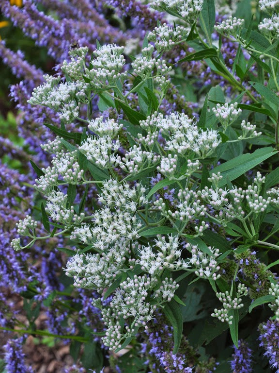 White Joe Pye Weed, Eupatorium altissimum 'Prairie Jewel': is pretty, but unlike the pink forms of Joe Pye Weed, 'Prairie Jewel' flops on rather weak stems. As you can see here in this picture, 'Prairie Jewel' ended up leaning heavily on the Agastache in front of it. Next year I must remember to support it properly. 'Prairie Jewel' blooms later than the pink varieties I grow and is a welcome addition to my fall garden. Height: 60-90 cm (24-36 inches), Spread: 60- 90 cm (24-36 inches). Full sun. Average to moist growing conditions. Zones: USDA 4-9.
