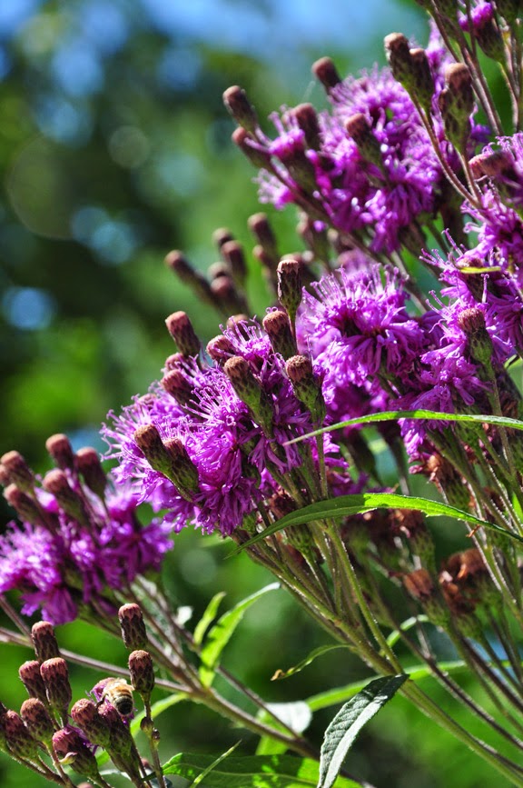 Ironweed, Vernonia gigantea: is a skyscraper of a plant. Fairly new to my garden, there were exactly three stems crowned with purple flowers this summer. Height: 180-210 cm,