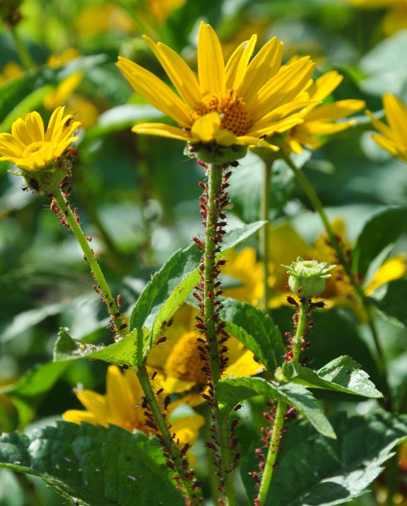 I get these ugly red aphids every summer on my false sunflowers, Heliopsis helianthoides Helene. They don't seem to bother the other plants at all, but just love these perennial yellow daisies.