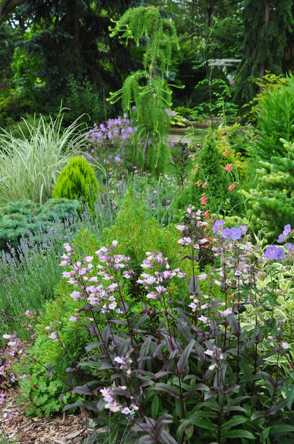 Penstemon and a dwarf Eastern white pine Pinus strobus 'Vercurve'
