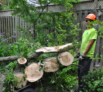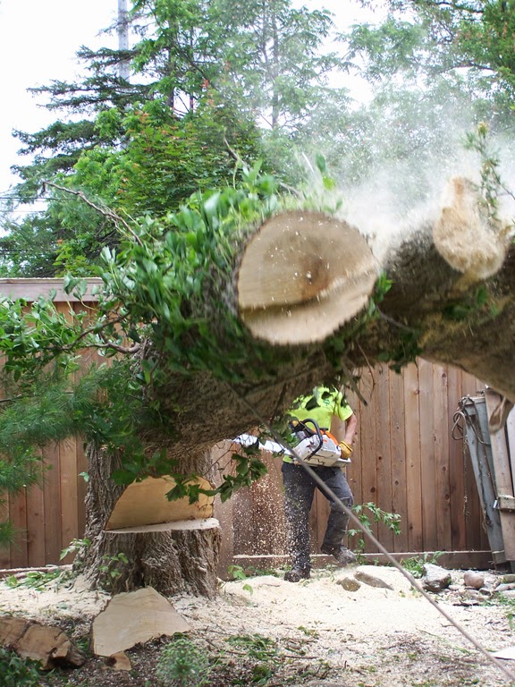 On Friday morning a small fleet of trucks and heavy equipment arrived to take down the two trees that were damaged in last winter's ice storm. This task took a team of eight burly fellows a full day to complete. Hubby took these pictures of the big event: