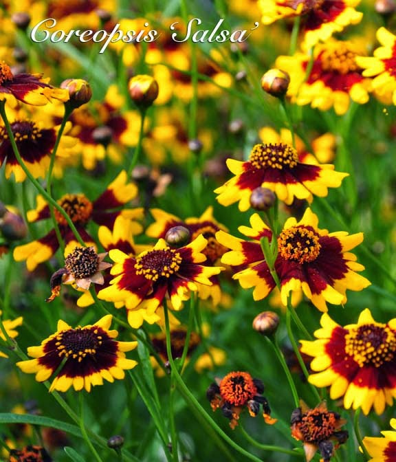 Coreopsis 'Salsa': is part of the same series as 'Jive' and is compact, upright annual with yellow flowers that have a reddish-brown centre. Full sun. Height: 30-45 cm, Spread: 30-45 cm.