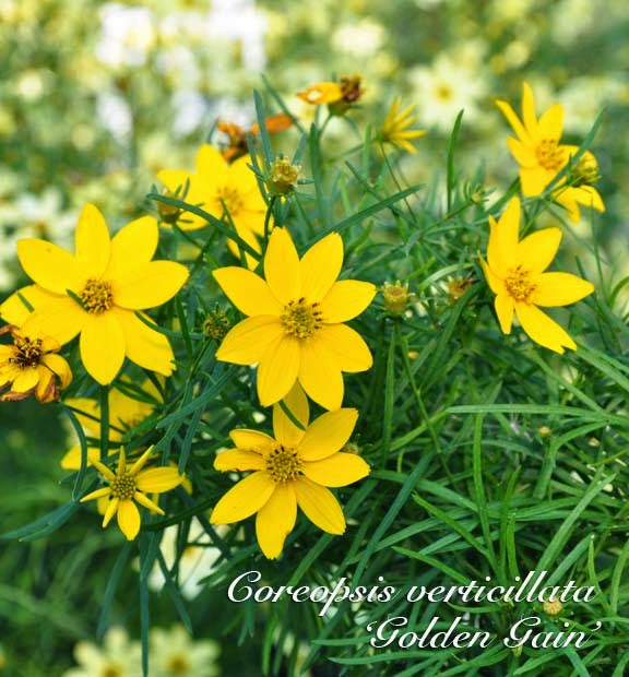 Coreopsis verticillata 'Golden Gain': offers the same golden yellow flower as 'Zagreb' on a plant that is a little taller than 'Moonbeam'. Again full sun. Height: 60-75 cm, Spread: 45-60 cm. USDA Zones 4-9.