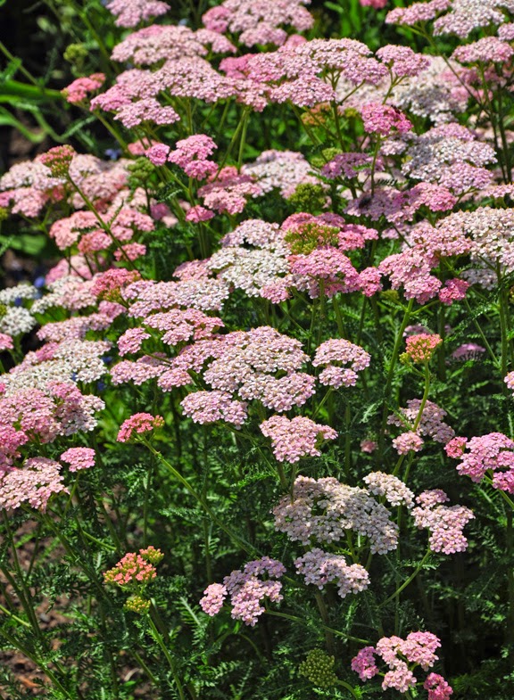 Pink Yarrow, possibly Achillea 'Wonderful Wampee' which is part of the same Tutti Frutti series of Achillea as 'Pomegranate', which you can also see in if you scroll down just a bit further. 'Wonderful Wampee' has soft pink flowers and is a nice, compact plant. Full sun and somewhat poor soil with good drainage. Height: 45-70 cm (18-27 inches) 45-60 cm (18-23 inches). Hardy USDA Zones: 4-9.