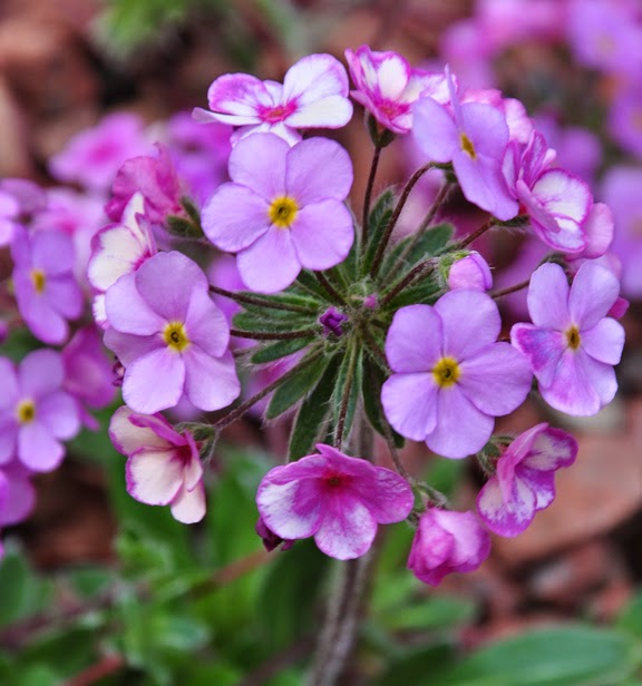 Sheriff's Rock Jasmine, Androsace sarmentosa 'Sherriffii': has mauve flowers and evergreen rosettes that form a trailing carpet. Excellent drainage is key to having success with this plant. Full sun or light shade (they may need a little afternoon shade in warm regions). Height: 10-12 cm (4-5 inches), Spread: 30-45 cm (12-18 inches) USDA Zones 3-9.