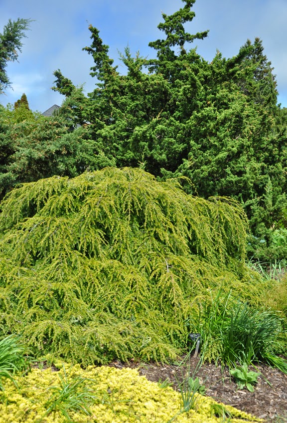 The golden colored groundcover is Juniperus horizontalis. The weeping evergreen is Thuja canadensis 'Pendula'. The upright conifer is Juniperus chinensis 'Iowa'.