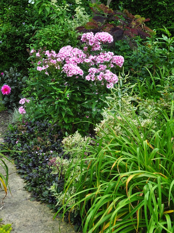 At the foot of this pink Phlox is the purplish-black foliage of Bugleweed, Ajuga. Here is a reference to a variety of Ajuga you might want to consider for your own garden: