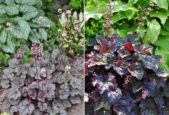 There are any number of Heuchera with dark foliage that you can choose from. Some Heuchera, like the Heuchera 'Silver Scroll' on the left, are an interesting combination of frosted leaf surfaces with dark undersides and flower stems.