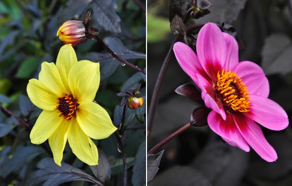 Here are just two: Dahlia 'Mystic Illusion' has nearly-black foliage with yellow flowers. Dahlia 'Happy Single Wink' has a single magenta flowers and striking black foliage .