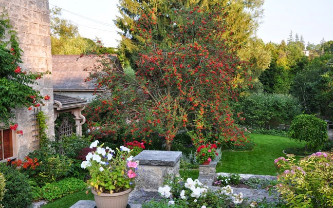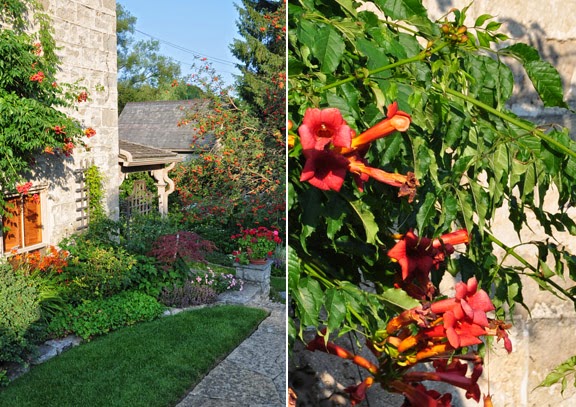 I think it was all the pops of vivid orange and red that caught my eye as we drove by: the trumpet vine on the side of the house, the bright geraniums in terra cotta pots and the Mountain Ash berries in the distance.