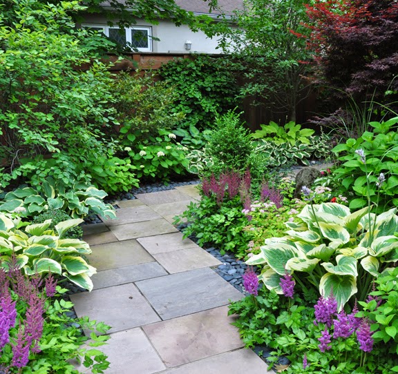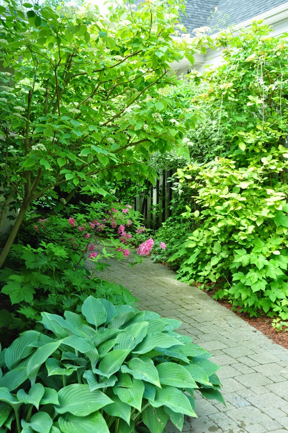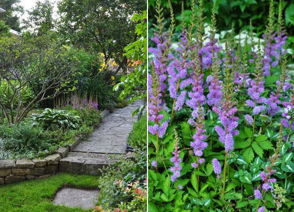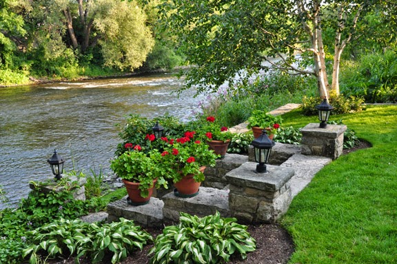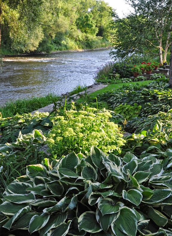 Under the broad limbs of mature trees, the riverbank area is quite shady. The plantings here incorporate an interesting mix of hosta, Periwinkle, Astilbe and some sedum for late summer color.