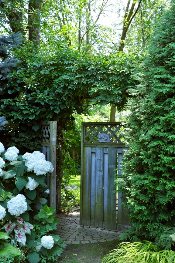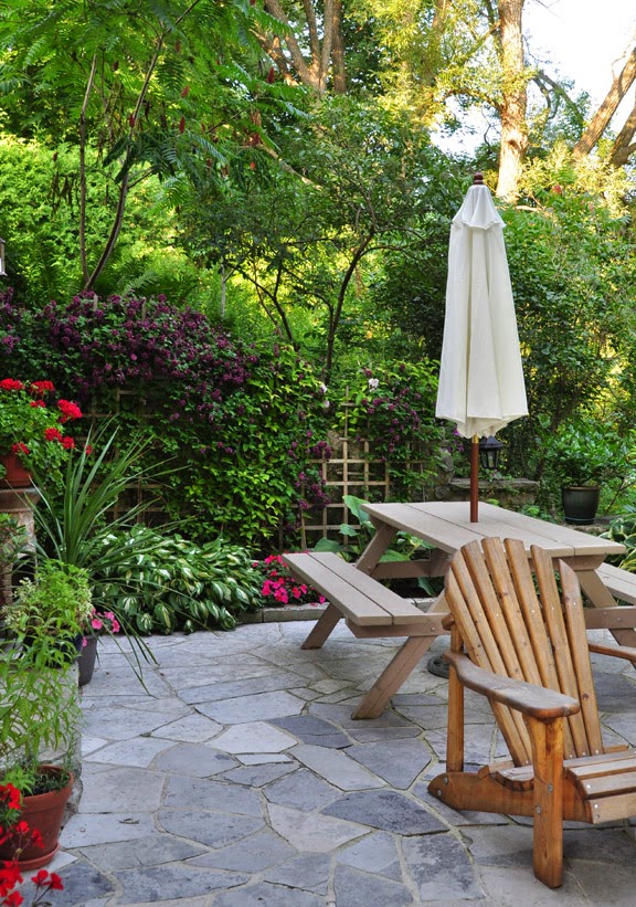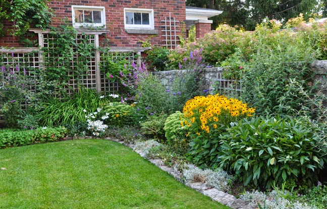 At the far end of the garden a trellised wall helps disguise the neighbour's garage. Incorporated into the plantings are peonies, Rudbeckia, sedum, daylilies and Butterfly Bush.