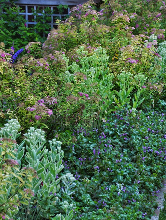 Here there are several Spirea bushes (pink flowers) interplanted with Sedum