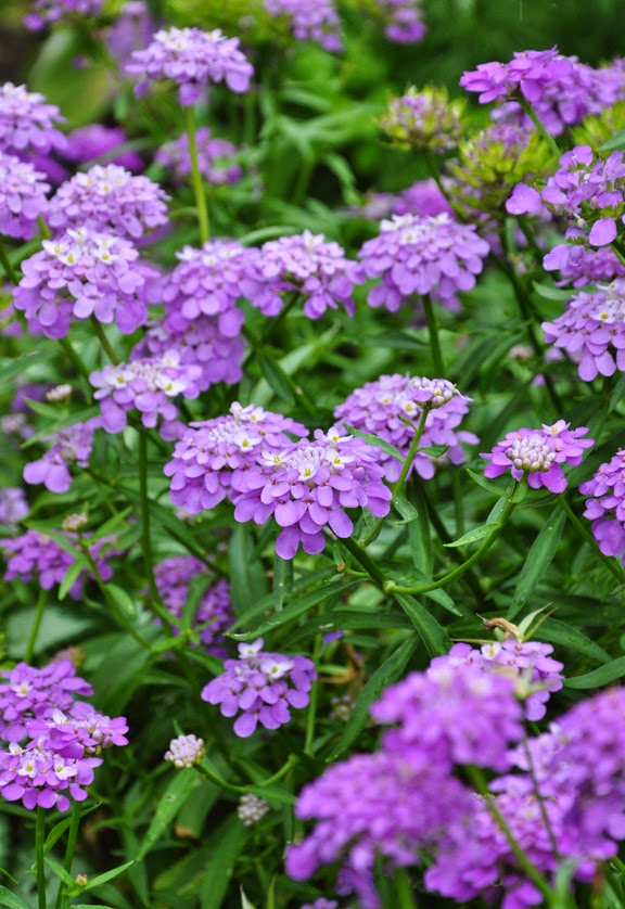 Lady's Mantle, alchemilla mollis: is a great foliage plant whose velvety leaves always manage to catch water droplets in the most beautiful way. Lady's Mantle has sprays of chartreuse flowers in early summer. Cut back the plant after it flowers to rejuvenate the foliage and keep the plant looking tidy.