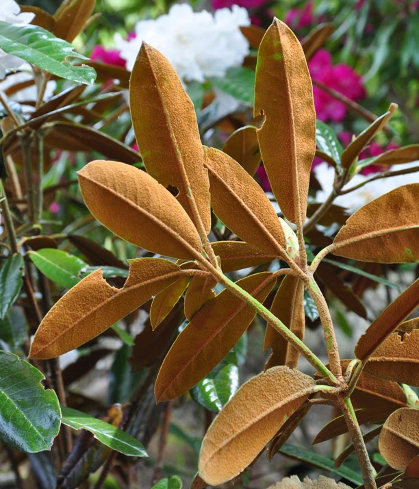 This is Rhododendron 'Teddy bear' in Donna's garden. The brown indumentum on the underside of the leaves has a soft, furry texture. Donna tells me that, "Gardeners grow it more for the leaf than the bloom."
