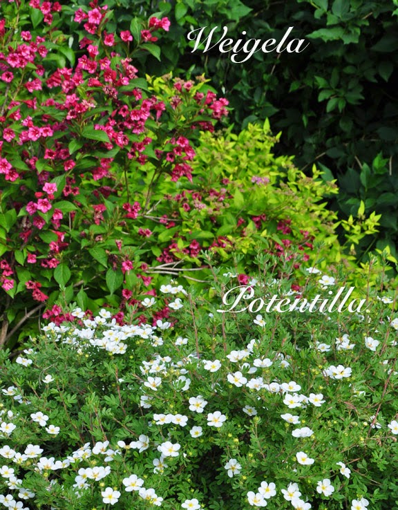 I have a white Potentilla and it is just the loveliest shrub. It starts blooming in June and continues to bloom into early fall. Think past the familiar yellow potentilla you see everywhere because, they also come in: white, pink, orange and red. Potentilla like poor soil and full sun. They flower on new wood, so I prune mine after the first flush of flowers in spring. Height and spread depend on the cultivar. My white Potentilla is about 3.5' x 4' and is vase shaped. USDA Zones: 2-7.