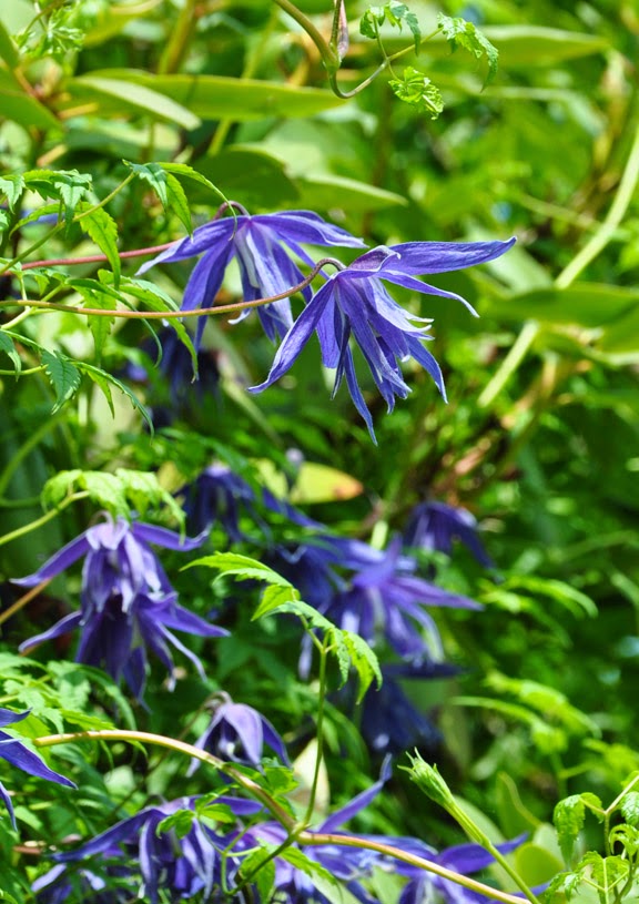 Clematis macropetala 'Bluebird': has nodding, bell-shaped, purply-blue semi-double flowers. This is a Group 1 Clematis that blooms in spring on the growth of the previous season. 'Bluebird' requires 4 to 6 hours of sun each day. Height: 8-10 ft. USDA Zones: 4-8.