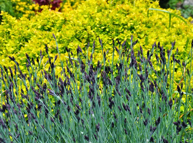 Grey foliage and the black flower buds of a Dianthus contrast beautifully with