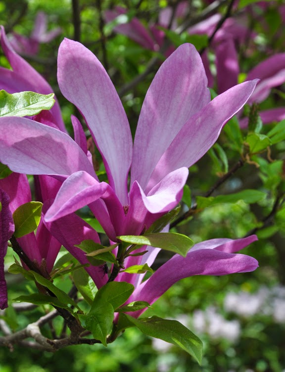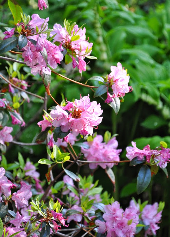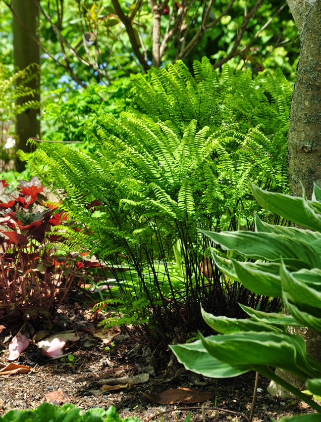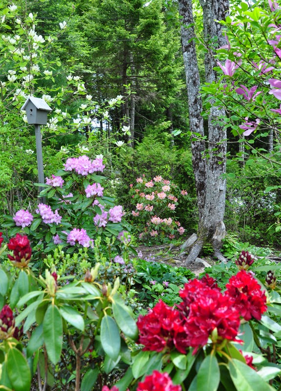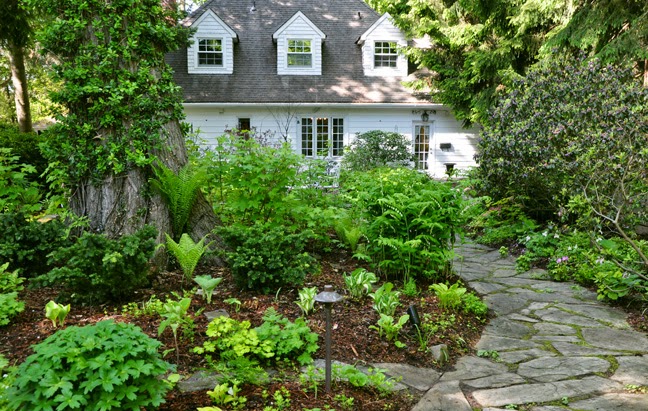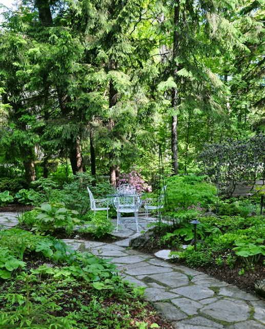 "I love them all", she says," Favourites are huge trees, the Trilliums and carpet of Scilla each spring, the Hellebores, Tree Peonies, the mini Clematis that grows on a natural trellis of Snakeroot and the Filipendula that jumps out of the garden like pink fireworks in July."
