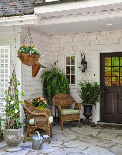 The trees on the property tower over the old carriage house. "I have many native plants and have tried my best to integrate what I have created into the natural surroundings of a very special woodland that is at the heart of this area- many of the trees in our backyard having never been cut," says Jamie.