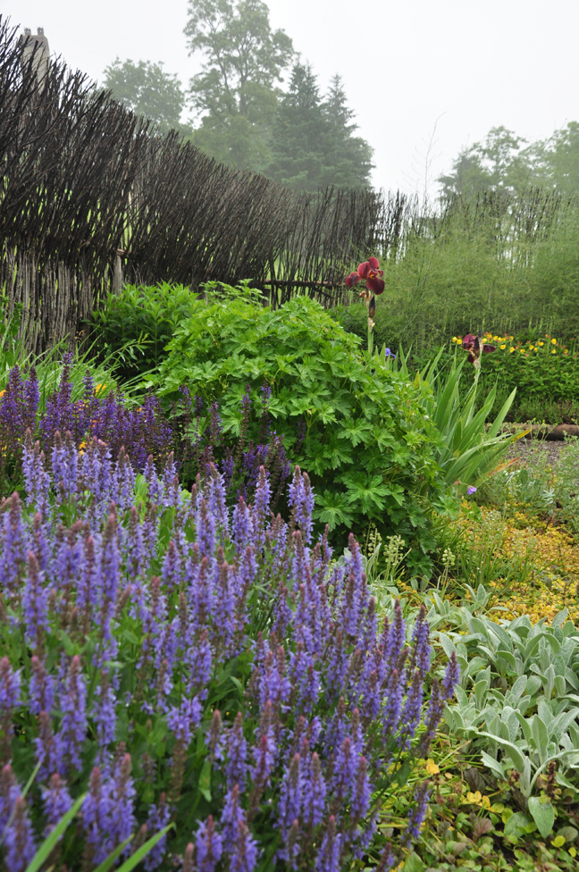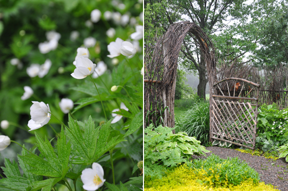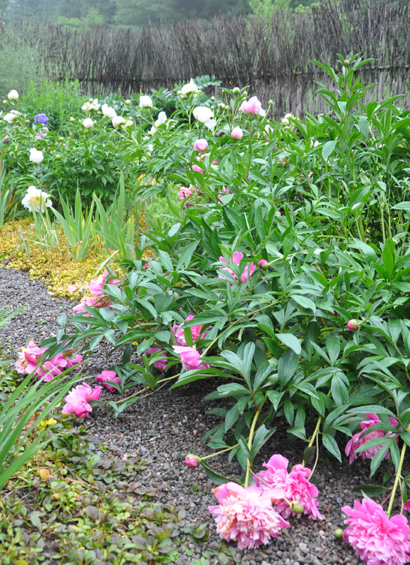 Inside the willow fence, the peonies bend to the ground in submission to the weather, but the other flowers and foliage glisten with raindrops.