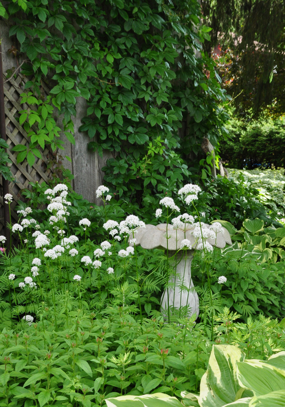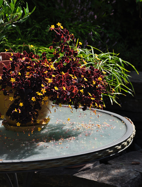 The golden color of the Creeping Jenny which carpets most of the flowerbeds easily makes up for any lack of sunshine.