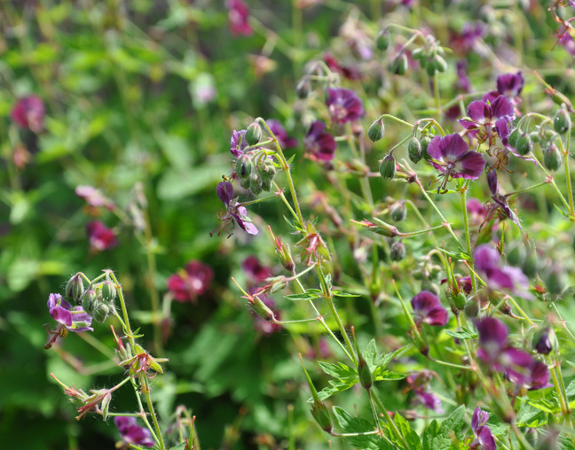 There is a sea of plum Geraniums at the back of the garden. There are a mix of two varieties of geranium: Geranium phaeum 'Samobor' and Geranium phaeum 'Mourning Widow'.