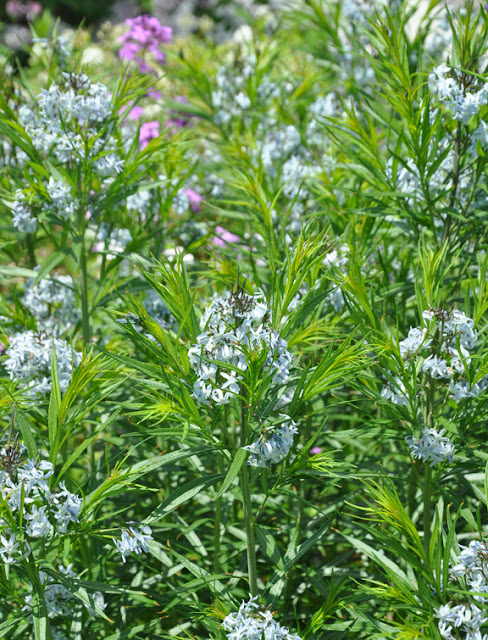 Blue Star, Amsonia tabernaemontana has green willow-like leaves and clusters of sky-blue flowers. Full sun or light shade. Average soil is fine and it will tolerate dry to moist conditions. Height: 60-90 cm (23-35 inches), Spread: 75-90 cm (29-35 inches). USDA Zones: 3-9.