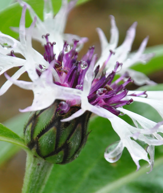 Centaurea montana 'Amethyst in Snow' has shaggy white flowers with a deep magenta centre. The foliage has a downy texture and a silver-grey-green color. Full sun and average garden soil. The plant reference I found suggests this plant likes moist soil, but mine seems happy enough in a fairly dry sunny spot. The front of a border is the perfect spot for this plant. Height: 30-40 cm (12-16 inches), Spread: 30-60 cm (12-23 inches). USDA Zones: 3-9.