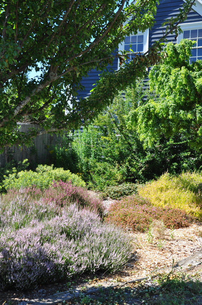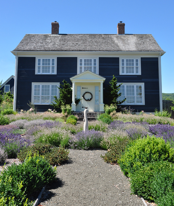 It's the simple, salt-box design of the dark blue house with its crisp white trim that first catches your eye and the garden in front of the house that holds it there. Soft billowy clouds of lavender and heather together–what a striking combination!