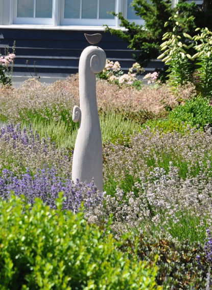 In the centre of the front garden is a stylized fiddlehead, the handiwork of a local stone carver. Perched on top of the fiddlehead fern is a naive carving of a little bird. In a busier setting the simple, unpretentious carving might be lost, but in this understated garden, it is the perfect focal point.