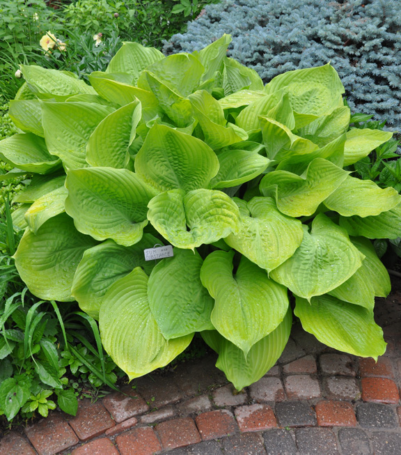 Below is a really popular Hosta called 'Sum and Substance'. It's one of the largest Hostas available with a spread that can reach five or six feet. The leaf color varies from chartreuse to gold depending on the amount of sunlight. The flowers are pale lavender.