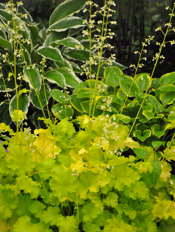 Another combination that makes use of yellowy-green. I am not sure of the particular Heuchera cultivar here, but Heuchera 'Citronelle' would be one that is similar.