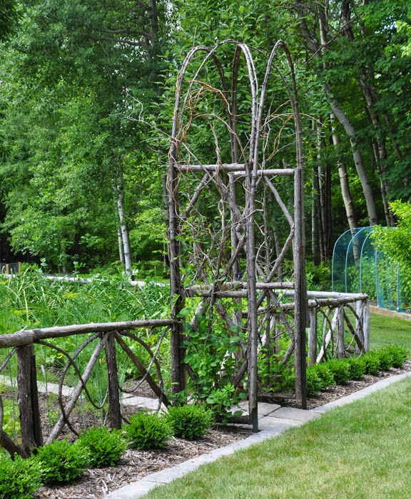 The structure is made with cedar posts and willow which is wattled or woven. (You can see more of this garden here: A Willow Garden in the Rolling Hills of Caledon, ON.)