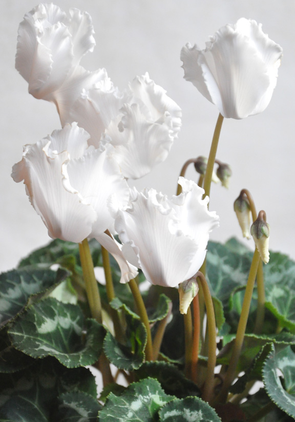 I have to concede that cyclamen have lots of great pluses. The flowers float like butterflies over their deep green foliage. Even the heart-shaped leaves, with their silvery-green markings, are beautiful.