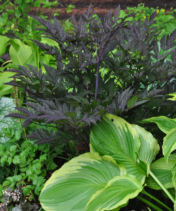 Angelica gigas, Thalictrums, Hosta, Japanese Ferns, Maidenhair Fern, Glade Mallow, Napaea dioica (Glade Mallow), Astilbe, Heuchera.