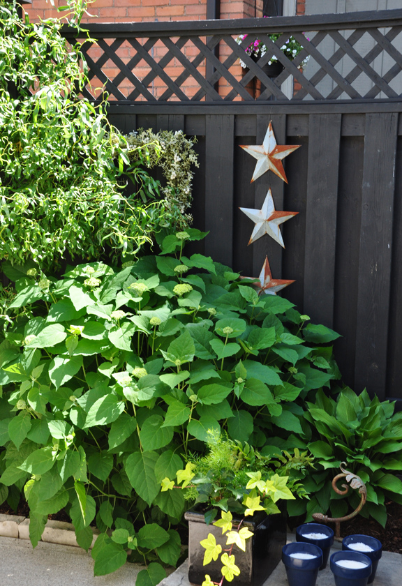 In the backyard, the fence has been stained charcoal, which sets off the fresh