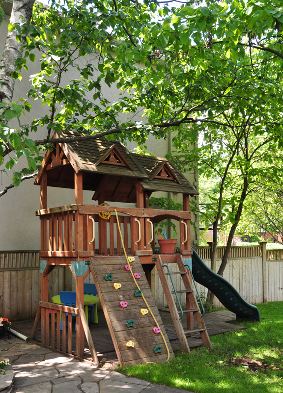 The property is wider than it is deep, but the garden doesn't feel small. Shrubs and evergreens hide the yard's boundaries and make it feel spacious and private.