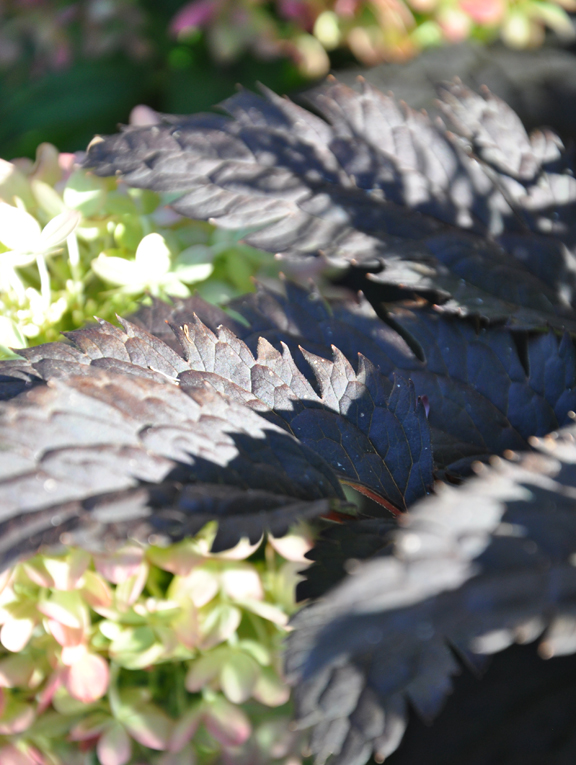In my garden, Actaea 'James Compton' is surrounded by a number of late bloomers. Hydrangea 'Little Lime' (Sun) is to one side. (Note: The hydrangea is just that little bit further out from under the Black Walnut tree and gets a bit more sun. It too loves the moist conditions).