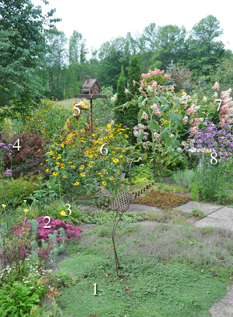 1. Thyme 2. Sedum 'Dazzleberry' 3. Yellow Moonflower, Oenothera acaulis var aurea 4. Barberry 5. Sunflower 6. Heliopsis helianthoides 7. Hydrangea paniculata 'Pink Diamond'