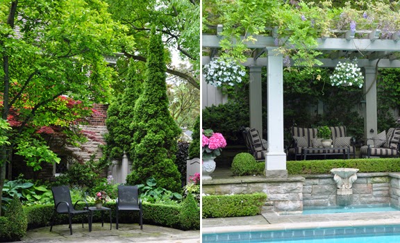 This garden in the Forest Hills area of Toronto incorporates a swimming pool into the garden in a tasteful way.
