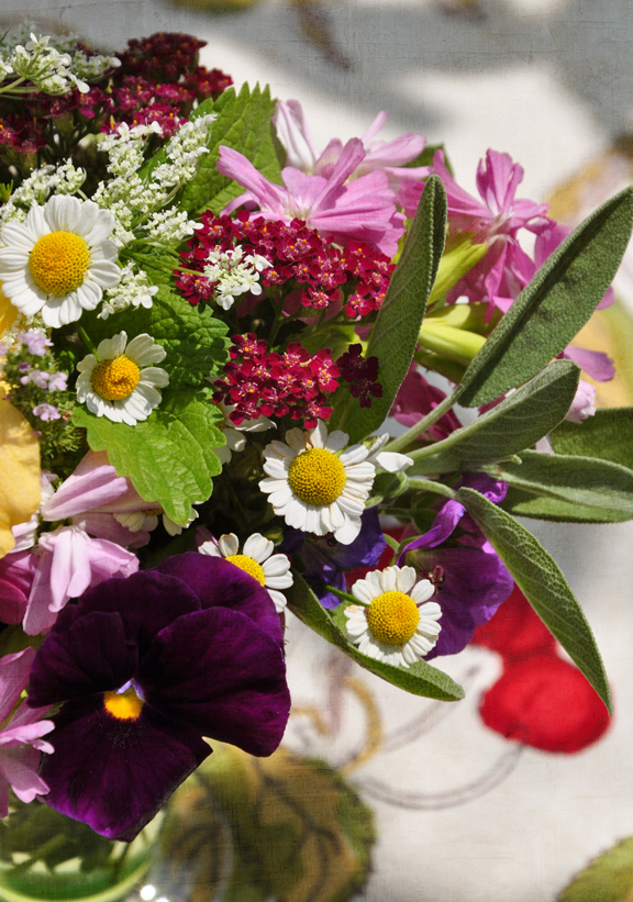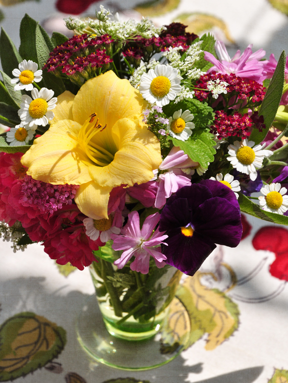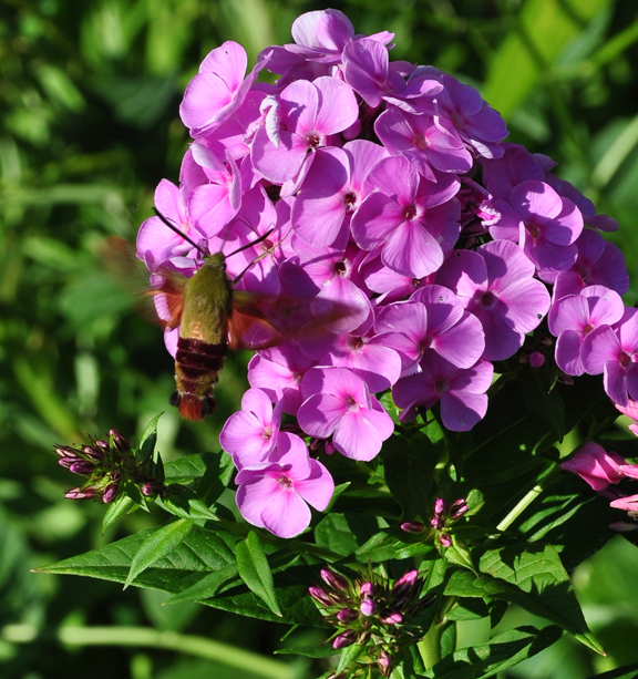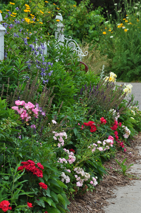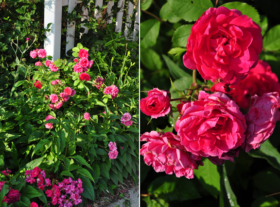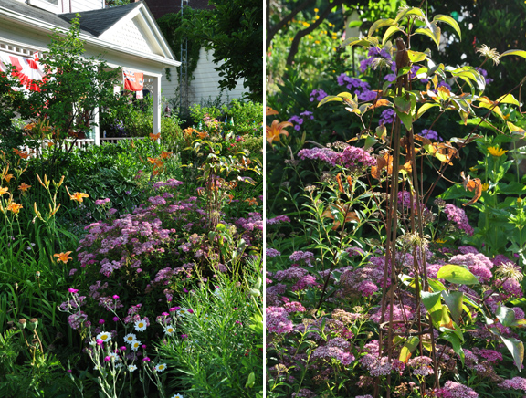 In the back garden there are lots of phlox in flower as well as annual poppies, lilies, bright-red monarda and dainty white and yellow feverfew.