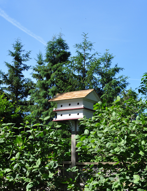 We did install this birdhouse that my husband and I designed and built a couple of years ago. Each of the two floors and the roof are a separate piece and are stacked together to make the whole birdhouse. This hopefully makes it easy to take apart and clean.