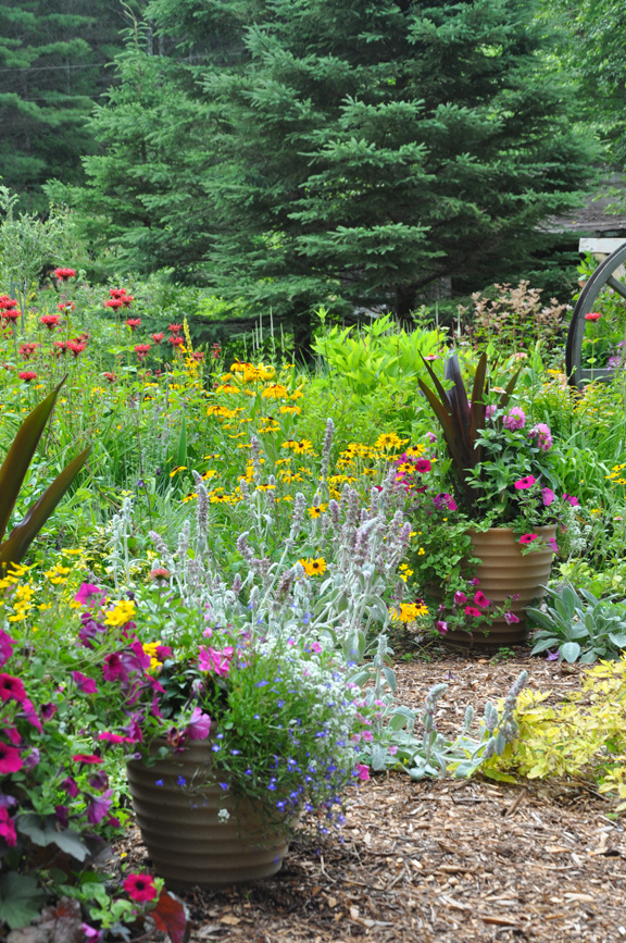 In the sunny backyard, she designed a deep flowerbed that has grown in size over the years. It now runs the entire length of one side of the yard and across the back of the property. One of the nicest features of the wide, sunny border is a waterfall and pond framed by a rustic arbour.