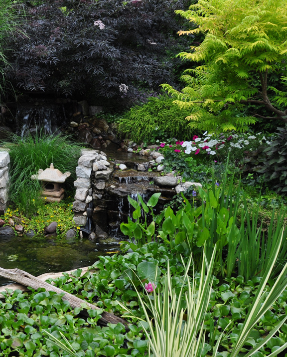 The small pond is set into the natural upward slope of the backyard.