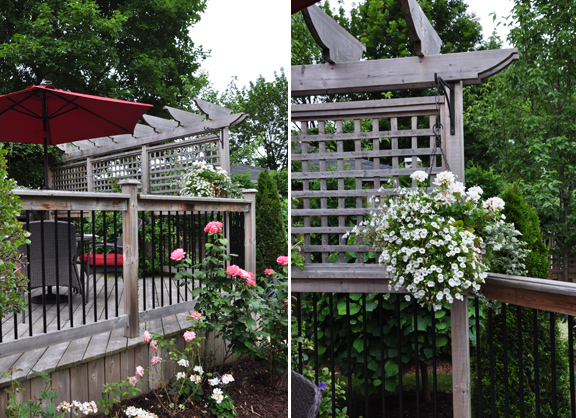 There is a generous deck right off the back door and overlooking the pond. On the right is a detail of the partition that helps keep this outdoor space private.