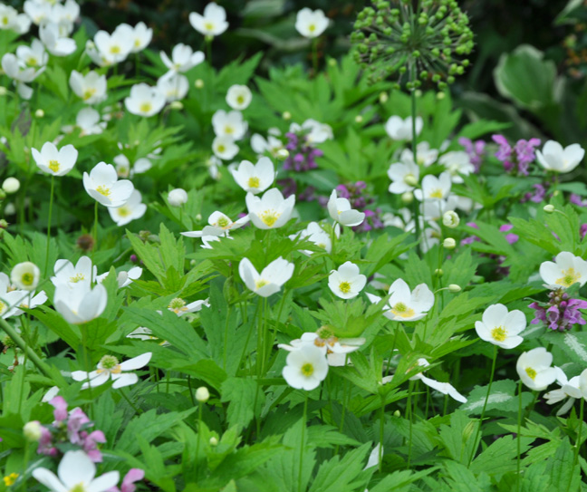 Anemone canadensis is an aggressive spreader, but lucky for me I planted it in an area where it can only go so far. It has single white flowers in June. This anemone likes normal to moist conditions and soil that is rich inorganic matter. Part shade. Height: 30-60 cm (11-22 inches). USDA Zones: 4-8.