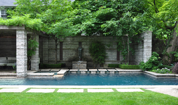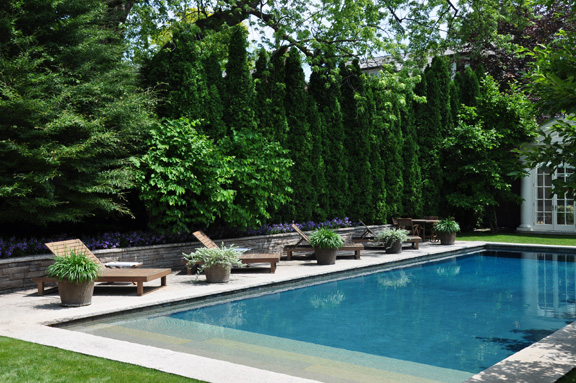 Because this was a house on a corner lot, the landscape designer had to deal with issues of privacy. Rather than building a fence, he opted to plant shrubs along the side of the house. In the backyard, a large screen was installed (below).