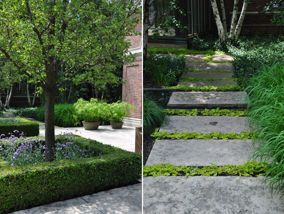 The garden is divided into four quadrants defined by clipped boxwood hedges. Inside each quadrant are ball-shaped yews and a single standard hydrangea. It's too bad the purple alliums weren't open in time for this picture.