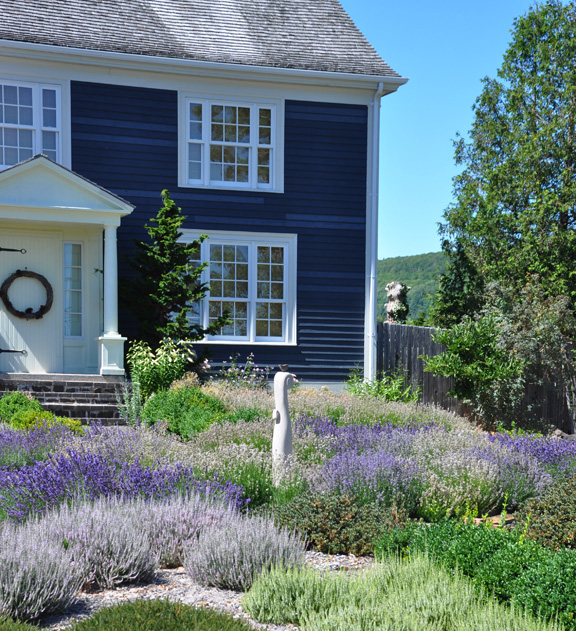 It's the simple, salt-box design of the dark blue house with its crisp white trim that first catches your eye and the garden in front of the house that holds it there. Soft billowy clouds of lavender and heather together–what a striking combination!
